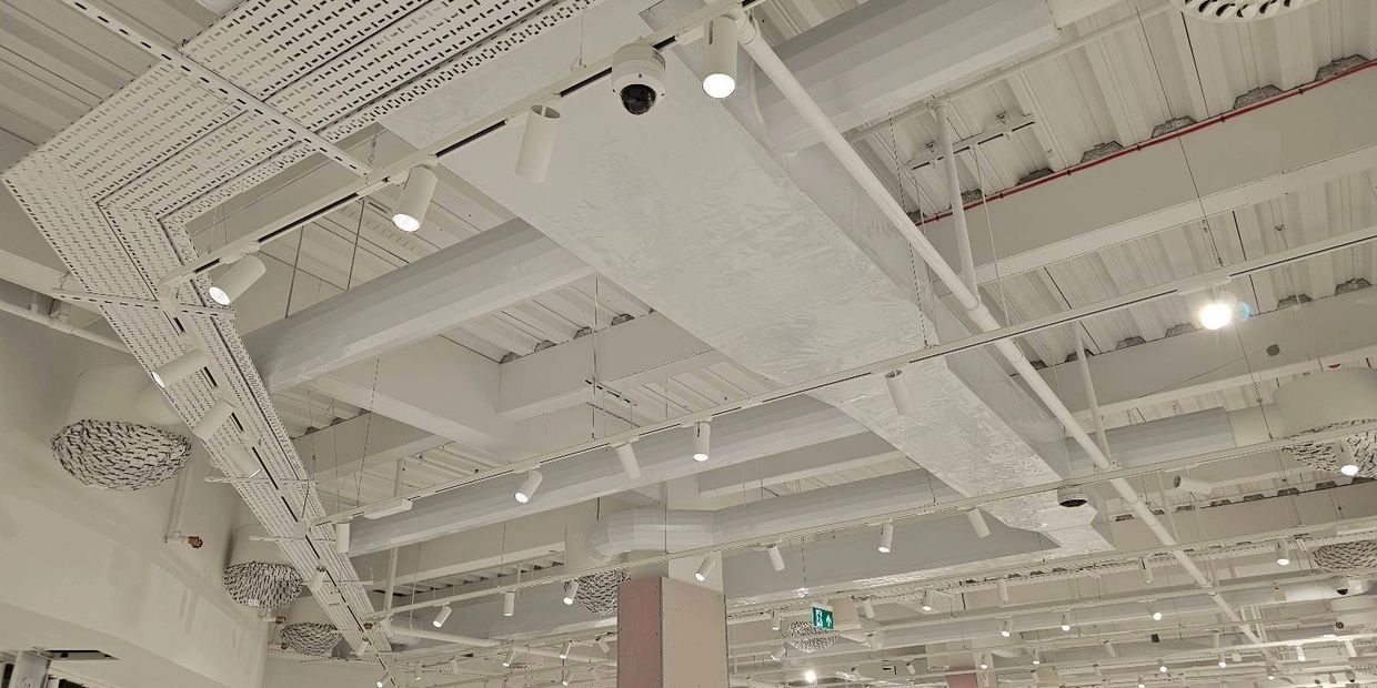 This store installation featured exposed ductwork, where we insulated the rectangular sections using 50mm mineral fibre to smoothly cover hangers and flanges, ensuring a seamless finish. These were then wrapped in White ProClad for a clean, professional look. The spiral ductwork was pre-insulated with 30mm Kingspan slotted board for efficient thermal performance.